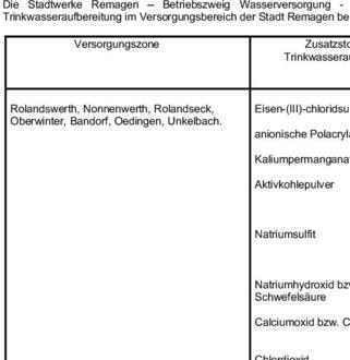 Die Stadtwerke Remagen – Betriebszweig Wasserversorgung - geben nachfolgend die Wasserhärte sowie die Zusatzstoffe zur Trinkwasseraufbereitung im Versorgungsbereich der Stadt Remagen bekannt: