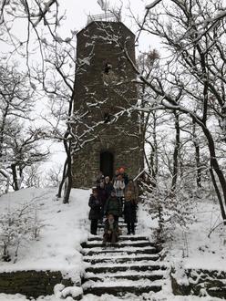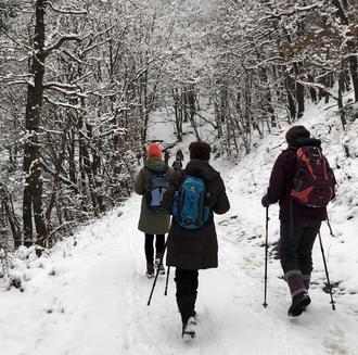 Dem Steinbergsbach folgend, ging es durch die Winterlandschaft vorbei an der Jodokuskapelle und einer Quelle und danach moderat hinauf zu Krausberghütte und Krausbergturm. Trotz diesigem Wetter bestaunten die Wanderer von der Aussichtsplattform Dernau mit den Weinbergen im Winterkleid. Nach Rast und Gruppenfoto wurde, teilweise auf malerischen Serpentinenpfädchen, wieder abgestiegen. Bei leckerem Essen, Getränken und netten Gesprächen klang diese abwechslungsreiche Wanderung im Culinarium aus. Noch ein kurzer Weg über die Behelfsbrücke auf die linke Ahrseite, wo es mit Bus und Bahn die Heimreise erfolgte.