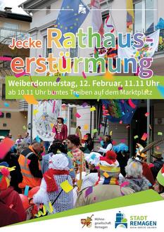 Das närrische Treiben beginnt um 10.11 Uhr mit musikalischer Unterhaltung auf dem Marktplatz. Neben dem Fändelschwenken und dem traditionellen Stippeföttchen-Tanz bildet um 11.11 Uhr die Erstürmung des Remagener Rathauses den Höhepunkt des Vormittags. Wie schon in den vergangenen Jahren werden die Möhnen mit allen Mitteln versuchen, das Rathaus in ihre närrische Gewalt zu bringen. Bürgermeister Björn Ingendahl und seine Mitarbeitenden stellen sich dabei erfahrungsgemäß als zähe Widersacher heraus, die unermüdlich versuchen, das Rathaus gegen den stürmischen Angriff zu verteidigen.