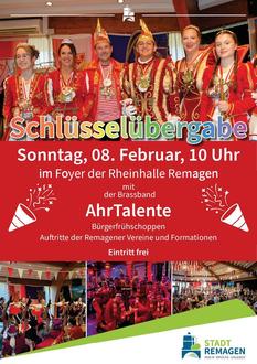 Der Gesamtstädtische Karneval Remagen (GKR) und Bürgermeister Björn Ingendahl laden am Sonntag, den 08. Februar 2026 zur festlichen Schlüsselübergabe in die Rheinhalle Remagen ein. Die Gäste dürfen sich auf ein buntes und unterhaltsames Programm freuen. Für närrische Stimmung sorgt die Brass Band AhrTalente mit Karnevalshits – unter dem Motto „Ramba Zamba Blasmusik“ wird jeder Ton zum Erlebnis. Die Band ist bekannt für ihre mitreißenden Auftritte, abwechslungsreichen Arrangements und eine besondere Nähe zum Publikum. Mit humorvollen Einlagen, mitreißenden Rhythmen und klassischem Blasorchester-Sound sorgt die Band dafür, dass kein Fuß stillsteht.