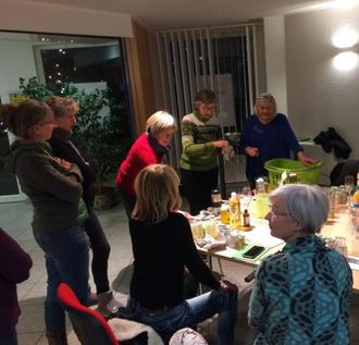 Nach den theoretischen Einführungen konnten die Teilnehmerinnen ihren aktiven Einsatz kaum erwarten. Über das mitgebrachte Kochfeld wurden die notwendigen Töpfe gefüllt und die mit Spannung erwartete Herstellung der „Pflegemittel“ begann. Beim selbstständigen Einsatz lernten sich alle besser kennen und halfen sich gegenseitig aus.