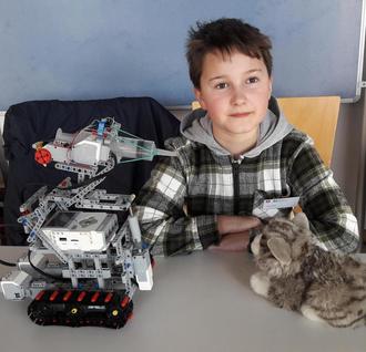 Levin Leyk mit dem Wasser spritzenden Katzenvertreib-Roboter.