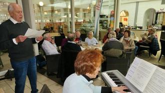 Kurt Gilles im Gesang und Arngard Schmidt bei der Präsentation eines Weihnachtsliedes auf der elektronischen Orgel mit den singenden Gästen im Hintergrund an den Tischen des Bistro-Restaurants der Römer-Thermen in Bad Breisig.