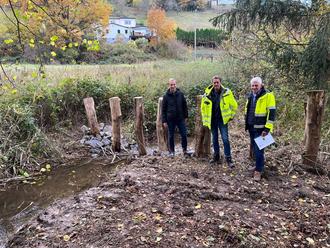 Sinzigs Bürgermeister Andreas Geron, Wolfram Kurz, technische Leitung Stadtwerke, und Stephan Porz vom Ingenieursbüro Porz & Partner (v.l.) an einem der sechs errichteten Treibgutfänger im Sinziger Stadtgebiet.