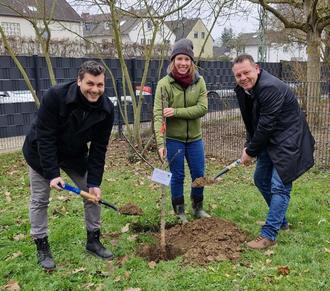 Gemeinsam mit Hannah Babel, Projektmitarbeiterin der SDW, der Leitung der Kita Daniel Odenwald (l.) und dem Beigeordneten der Stadt Sinzig Alexander Albrecht (r.) wurde der Apfelbaum auf dem Gelände der Kita gepflanzt.