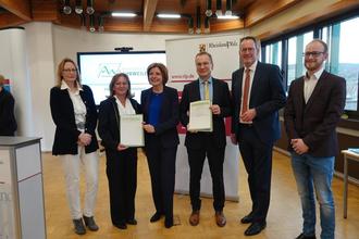 Bürgermeister Andreas Geron (3.v.r.) erhielt von Ministerpräsidentin Malu Dreyer (3.v.l.) und Innenminister Michael Ebling fünf Förderbescheide. Auch die Magic Majorettes wurden bedacht.