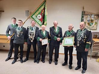 Beim Patronatsfest der Brohler Matthias Schützen wurden treue Schützenbrüder geehrt. Auf 40 Jahre Mitgliedschaft kann Major Werner Fusshöller zurückblicken. Für 50-jährige Mitgliedschaft wurde Walter Karst ausgezeichnet.