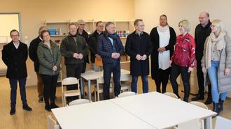 Bürgermeister Andreas Geron (5.v.r.), die zukünftige Einrichtungsleiterin Ann-Christin Wisskirchen (4.v.r.) und die Architektin Sarah Dünker-Wittland (3.v.r.) besichtigten gemeinsam mit den Sinziger Fraktionsvorsitzenden und weiteren Mitarbeiter*innen der Stadtverwaltung die Kita „Abenteuerland“ kurz vor der Eröffnung.
