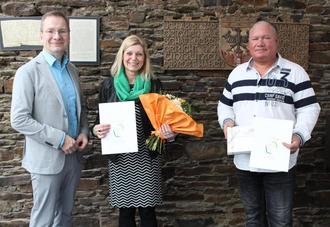 Bürgermeister Andreas Geron gratulierte den beiden Jubilar*innen Beatrix Roth und Heiko Frenzel (v.l.).
