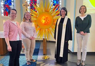 SINZIG. Dieses Lied sangen Kinder, Jugendliche und Erwachsene am Ostersonntag. In ganz unterschiedlicher, stimmungsvoller Atmosphäre erfasste die Osterfreude die Gottesdienstbesucher*innen der Kirchen der evangelischen Gemeinde Remagen-Sinzig. Um 6 Uhr brach der Ostermorgen in der Adventskirche in Sinzig an. In die stille, dunkle Kirche wurde die Osterkerze hereingetragen. Jesus vertreibt die Dunkelheit. Das war auch die Nachricht beim Familiengottesdienst in der Friedenskirche Remagen. Die Freude, die Maria Magdalena am Ostermorgen zum Strahlen brachte, bringt uns auch heute noch zum Strahlen. Als Ausdruck dieser Freude wurden von Klein und Groß während des Gottesdienstes Sonnenstrahlen in eine Sonnenscheibe gesteckt.