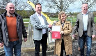 Katrin Eder übergibt den Förderbescheid an den Vorsitzenden des AZV Untere Ahr, Remagens Bürgermeister Björn Ingendahl. Links daneben der technische Werkleiter Martin Hoffmann, rechts sein kaufmännisches Pendant Bernd Lischwè