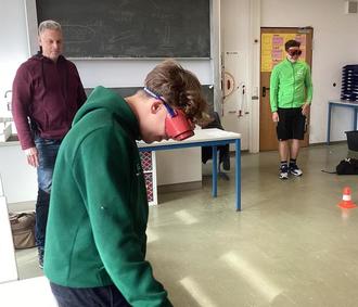 Den spannendesten Teil der Veranstaltung durften die Jugendlichen dann am eigenen Körper erfahren: Herr Eichmann hatte einen Parkour mit verschiedenen Aufgaben im Gepäck und stattete die Jugendlichen mit einer Alkohol- und einer Drogenbrille aus. Mit diesem benommenen Sichtfeld musste nun jeder die verschiedenen Hindernisse durchlaufen und schnell war man sich einig: Mit Drogen im Körper geht hier garnix.....
