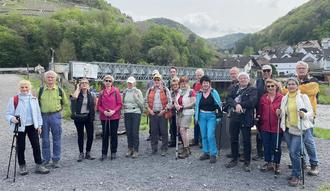 BAD BREISIG/BROHLTAL. Die beiden OG Bad Breisig und Brohltal im Eifelverein haben sich entschlossen im 2. Quartal 2024 gemeinsame Wanderungen anzubieten. In Fahrgemeinschaften fuhr man gemeinsam an die Ahr. An der Behelfsbrücke in Rech wartete die Wanderführerin Ulrike Kuhlmann von der OG Brohltal um die zahlreichen Wanderer zu begrüßen und in einer kleinen Ansprache die Wanderroute zu erläutern. Über die Behelfsbrücke ging es an den Brückenpfeilern, der durch die Flut zerstörten, historischen Nepomukbrücke vorbei durch Rech. Am Waldrand vorbei führte der Weg stetig bergauf bis zu den ersten Weinstöcken die terrassenförmig rund um die Saffenburg die Hänge säumen. Der steile Anstieg zur Burgruine forderete die Kräfte der Wanderer, war aber schell vergessen und gab einen herrlichen Rundumblick ins Ahrtal und das Ahrgebirge frei. Bergabwärts führte der Weg nun nach Mayschoß und dann bergauf durch den Ort bis zum Michaelishof. Hier wimmelte es nur so von Ahrtaltouristen, die das Wochenende nutzten um die Tage der offenen Weinkeller zu besuchen. Die Wanderführerin beschloß diesmal den stark frequentierten Rotweinwanderweg zu meiden und führte die Gruppe an Weinhängen vorbei in Serpentinien durch den höher gelegenen Wald auf die Höhe des Ahrtals. Diese Höhenlage kannten die meisten Wanderer noch nicht und waren beeindruckt von der erwachenden Natur mit ihren leuchtenden Ginsterbüschen und der Blütenpracht der säumenden Bäume. Oben angekommen öffnete sich ein unerwartet herrlicher Blick ins Ahrtal. Schnell wurde klar, das es sich um die Höhenlage von Rech handelte und wie von selbst folgten die Wanderer dem Wirtschaftweg und erreichten gut gelaunt den Parkplatz vor der Brücke.