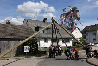 Auch in diesem Jahr ging das Aufrichten des Baumes, das nach altem Brauch nur mittels Muskelkraft und unter Zuhilfenahme von zwei „Schwalben“ geschieht, zügig voran. Schnell war der geschmückte Baum am vorgesehenen Standort in der vorbereiteten Halterung aufgerichtet und gesichert und grüßt jetzt aus luftiger Höhe die Waldorfer Bürger und die Gäste während des Wonnemonats Mai.