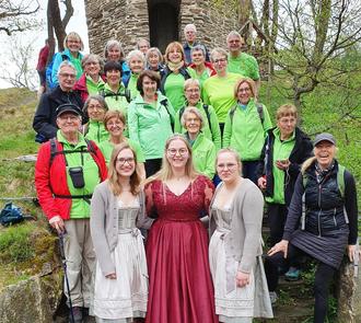 DERNAU/SINZIG. Das Bergfest des Eifelvereins Dernau am 1. Mai lockt Scharen von Wanderern auf den Krausberg. Auch im Eifelverein Sinzig hat dieser Termin einen festen Platz. Mehr als 20 Wanderbegeisterte, geführt von Ingelore Drever, bestiegen in Bad Bodendorf die Ahrtalbahn um an diesem beliebten Fest teilzunehmen. Zur Freude aller war der Ahruferpfad zwischen Walporzheim und Dernau wieder begehbar. Das lichte Grün der Bäume erlaubte wunderschöne Ausblicke auf den munter plätschernden Fluss, die „Bunte Kuh“ und die Weinhänge auf der gegenüberliegenden Seite. An der Steinbergsmühle begann der moderate aber stetige Aufstieg zum Krausberg. Mitten im Wald am „Dernauer Platz“, wo sich viele Wege kreuzen, war der höchste Punkt erreicht. Zielsicher, das letzte Stück auf felsigem Pfad, wanderte die Gruppe nunmehr in Richtung Krausberghütte. Blasmusik in der Ferne beflügelte die Schritte zur wohlverdienten Rast. Erbsensuppe, Kaffee, viele Sorten Kuchen und Getränke aller Art warteten auf die Wanderer am Krausbergturm. Ein kleiner Schauer tat der guten Laune keinen Abbruch und die überraschende Begegnung mit der Dernauer Weinkönigin Ronja Josten und den Weinprinzessinnen Nadja Sebastian und Laura Nietgen krönte den geselligen Wandertag. Ein Gruppenfoto mit den Weinmajestäten musste sein, bevor der Rückweg durch das urige Heckenbachtal angetreten wurde.