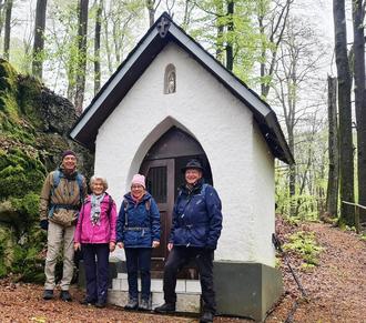 SINZIG. Am 21.4.2024 wanderte eine kleine Gruppe des Eifelvereins Sinzig bei echtem Aprilwetter im Westerwald. Wanderführerin Silvia Sielaff führte die Wanderer in Ötzingen zunächst auf den 422m hohen Malberg. Der erloschene Vulkan erhebt sich südlich von Ötzingen am Ostrand des Kannenbäckerland. Der Malberg, heute ein Naturschutzgebiet, war in der Vorzeit als Thing- und Gerichtsstätte eine heilige Höhe. Auf halber Strecke bergauf besichtigte die Wandergruppe eine idyllische Waldkapelle. Auf dem flachen Gipfel des Berges liegen verstreut viele große moosüberwachsene Basaltfelsen. Bei leichtem Schneefall erzeugten sie im Zwielicht einen verwunschenen Eindruck. Besonders markant und eindrucksvoll waren zwei große Felsen, im Volksmund die "Wildweiberhäuschen" genannt. Einst sollen darin drei wilde Frauen gehaust haben, die als Hexen verschrien waren und gelegentlich in den umliegenden Dörfern bettelten. Weiter ging es zu einer Tongrube. Hier lagern die Grundstoffe für die berühmte Westerwälder Salz-Glasurkeramik. Ihr verdankt das Kannenbäckerland seinen Namen. Noch heute wird der wichtige Rohstoff abgebaut.