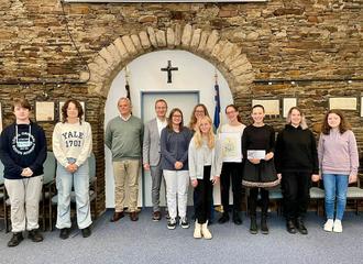 Die Nachhaltigkeits-AG des RGS unter der Leitung von Phyllis Kohnen (6. v.l.), Schulleiter Dr. Jens Braner (3. v.l.) zusammen mit Bürgermeister Andreas Geron (4. v. l.) im Sinziger Ratssaal.