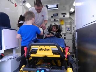 Brohler Kita Kinder inspizierten einen Rettungswagen und stellen viele Fragen.