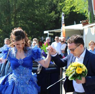 Bürgermeister Marcel Caspers geleitete die neue Brunnenkönigin Sophie I. zu ihrer Krönung. Bei seiner Ansprache im Rahmen der Zeremonie fügte er mit Blick auf das Wetter und seine persönliche Fußballleidenschaft scherzhaft hinzu: „Was kann es für einen Schalker dieser Tage Schöneres geben, als ein königsblaues Kleid.“
