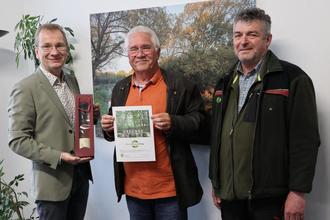 Bürgermeister Andreas Geron (l.) und Revierförster Stephan Braun (r.) gratulierten Boris Kuntzmann aus Rheinbach zum Erwerb des 1000. Partnerschafts-Anteils.