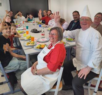 AHRTAL. Kürzlich fand ein Intensivkochkurs in der Übungsküche der Levana - Schule in Bad Neuenahr-Ahrweiler statt. Unter Anleitung von Spitzenkoch Jean-Marie Dumaine mit seiner Frau Colette wurde eifrig geschnibbelt, gekocht und abgeschmeckt. Unterstützt wurde die Gruppe dabei von Aufwind Projektleiter Michael Müller, Klassenlehrerin Frau Roguljic sowie 2 weiteren Mitarbeiter*innen der Schule.