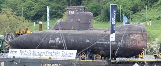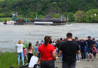 RHEINSCHIENE. DG. So etwas gibt es sicher nicht oft zu sehen: Ein „ausgewachsenes“ U-Boot schipperte dieser Tage auf dem Rhein. Da das knapp 50 Jahre alte Gefährt bereits 2010 aus den Diensten der Bundesmarine ausgemustert wurde, allerdings nicht mehr mit eigener Maschinenkraft. Das rund 500 Tonnen schwere und rund 48 Meter lange Stahlungetüm wurde auf einem schwimmenden Ponton transportiert. Start war Ende April in Kiel, dann ging es durch den Nord-Ostseekanal, die deutsche und niederländische Nordseeküste entlang bis nach Rotterdam und dann rheinaufwärts bis zum Zielort Speyer. Von dort aus wird das Boot mit einem Schwertransport zum Technikmuseum nach Sinsheim weitergebracht. Wie zu erwarten, lockte das Spektakel zahlreiche Neugierige an, die es sich, versehen mit ausreichend Verpflegung, teilweise auf Campinggestühl bequem machten. Parkplätze in Rheinnähe waren am Sonntag daher Mangelware. Ein nicht alltägliches Schauspiel ganz besonderer Art.