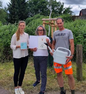 Sinzigs Klimaanpassungsmanagerin Luzia Heinzelmann (l.) und Baumkontrolleur Hendrik Kardinal (r.) bedankten sich bei Andrea Schraaf-Wilhelmy, die sich als erste Baumpatin gemeldet hatte, für ihr Engagement.