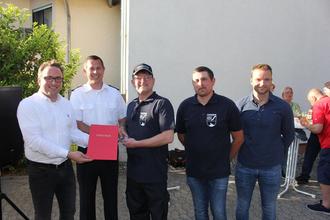 Beim Floriansfest der Freiwilligen Feuerwehr Gönnersdorf konnten Bürgermeister Marcel Caspers und Wehrleiter Ronny Zilligen (von links) Markus Rode neu in die Wehr aufnehmen. Zu den ersten Gratulanten gehörten Wehrführer Florian Braun (2. von rechts) und Ortsbürgermeister Andreas Heuser (rechts).