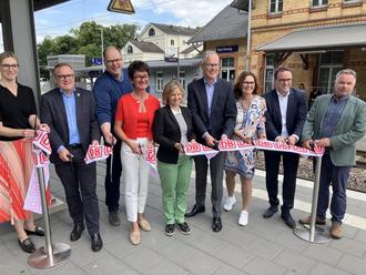 Umweltministerin Katrin Eder (Mitte) zerschnitt symbolisch das Band zur Einweihung des neuen Bad Breisiger Bahnhofs
