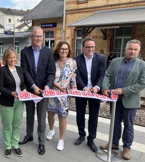 Seit Januar 2023 wurde gebaut. Nun erstrahlt der Bahnhof Bad Breisig in neuem Glanz und Umweltministerin Katrin Eder (links) zerschnitt das Band. Bürgermeister Marcel Caspers (2.v.r.) freute sich hat mitgeschnitten.