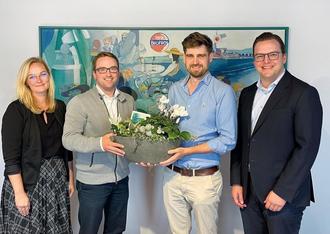 Der Bürgermeister der Verbandsgemeinde Bad Breisig, Marcel Caspers (2.v. l.) , sowie die Wirtschaftsförderin, Angela Lunowa (l.), waren bei den neuen Verantwortlichen des Brohler Mineralbrunnen zu Gast. David (r.) und Martin Schilling haben als 5. Generation die Verantwortung übernommen.