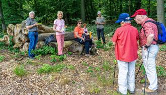 Im Schatten ließ es sich jedoch aushalten. Am Platz des neuen Generationenwaldes rastete man auf ganz neuen Bänken. Das Winzerhäuschen ließ man links liegen. Auch der Mühlenberg war von einigem Kahlschlag betroffen, die Flächen schließen sich aber schon wieder mit Sträuchern und Birkenbäumen. Gegen Mittag erreichte man die Cäcilienhütte und ergatterte schattige Plätze im Außenbereich. Bei kühlen Getränken und leckerem Essen saß man ausgiebig zusammen, bis man die Rückfahrt nach Bad Breisig antrat.