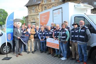 Mit ihren neuen, vom Rotary Club Bad Neuenahr-Ahrweiler gespendeten Westen können sich die Tafelfahrer und -Fahrerinnen sehen lassen. Ein einheitliches Erscheinungsbild hilft dem Fahrerteam bei den vielen Außenterminen. (Von links) Professor Dr. Klaus Prenzel von den Rotariern, Dieter Zimmermann, Präsident des Rotary Clubs Bad Neuenahr-Ahrweiler, Tafelfahrer Kuno Herchenbach sowie (rechts daneben und vorn) Dr. Willi Schulz von den Rotariern freuten sich mit den Fahrerkolleginnen und –Kollegen, die alle zur Spendenübergabe gekommen waren. „Mit den 30 Sicherheitswesten sind wir super ausgerüstet und können ganz anders als Tafel auftreten“, bedankte sich Kuno Herchenbach für die großzügige Spende beim Rotary Club Bad Neuenahr-Ahrweiler.