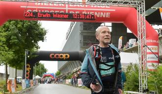 Je näher der krönende Abschluss eines Urlaubs rückte, umso schlechter wurden die Wettervoraussagen für die „Nacht der Nächte“. Schließlich wurde eine Unwetterwarnung herausgegeben. Als mögliche Auswirkungen wurden genannt: „Hohe Blitzaktivität, Sturmböen, Starkregen und Hagel. Stärkste Phase gegen 02:00 Uhr in der Nacht zum 7. Juni“. Von einer Absage des Laufs war aber zu keinem Zeitpunkt die Rede. So standen um 22:00 Uhr 950 LäuferInnen am Start in der Tissot-Arena in Biel. Als er das Ziel in der Tissot-Arena nach 12:30 Stunden erreicht hatte, freute er sich sehr über die Begrüßung durch den Stadionsprecher: „Und hier kommt Erwin Wagner aus Deutschland. Er ist erster der AK M70, und das mit einer Zeit, die soll ihm in diesem Alter mal einer nachmachen.“ Von den 950 gestarteten hatten 216 aufgegeben. Erwin belegte im Gesamtfeld den 224. Platz.