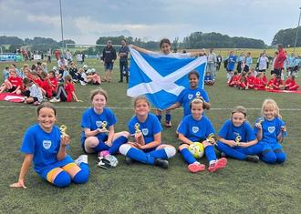 WEYERBUSCH/BAD BREISIG. Als Team Schottland gingen unsere Spielerinnen der SG Bad Breisig bei der E-Juniorinnen Mini-EM in Weyerbusch an den Start. Nach sechs Spielen und einer Bilanz von zwei Siegen, zwei Unentschieden und zwei Niederlagen, u.a. gegen die späteren Sieger aus der Schweiz (Freirachdorf) war nach der Vorrunde das Turnier unserer Mädels leider vorbei, dennoch ein schönes Erlebnis für die Spielerinnen, Eltern und Trainerin Steffi H. „Das Halbfinale wäre drin gewesen, wenn die Gegentreffer zu den beiden unentschieden nicht etwas unglücklich und kurz vor Schluss gefallen wären, aber bleiben wir realistisch, denn das ist Fußball und als „zusammengewürfelte“ Mädelsmannschaft können unsere Mädels echt Stolz auf sich sein. Ich bin es auf jeden Fall, individuelle Klasse und Teamgeist, das macht Lust auf mehr.“ Insgesamt spielten vierzehn Nationen und mehr als 140 Spielerinnen um den Sieg. Jede erhielt einen Pokal, ein Stirnband und das Teamshirt als Erinnerung. Wir danken dem FVR und dem SSV Weyerbusch für die Organisation und Ausrichtung dieses Turniers. Eine gelungene Veranstaltung # nicht ohne meine Mädels.