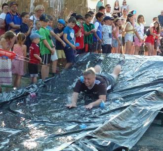 Einer der Höhepunkte der Westumer Kirmes ist immer das Schürreskarren-Rennen. Eine Aufgabe dabei: Mit Schwung die meterlange mit Seifenlauge präparierte Rutsche runter...