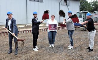 Beim symbolischen Spatenstich (v.li.) Bürgermeister Andreas Geron, Kreiswirtschaftsförderer Tino Hackenbruch, Geschäftsführerin Nane Hartmann, Marc Ulrich und Sinzigs Wirtschaftsförderer Oliver Göbel