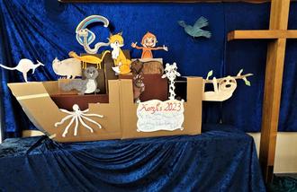 Zwölf unterschiedliche Tiere mit ihren ganz besonderen Fähigkeiten, von den Konfirmand*innen gewählt und gestaltet, tummeln sich auf der Arche.