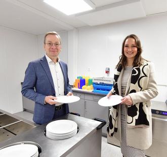 Sinzigs Bürgermeister Andreas Geron (l.) und GEWI-Geschäftsführerin Sofia Lunnebach freuen sich über die nun wieder geschaffene Möglichkeit der Essensversorgung im Sinziger Schulzentrum.