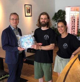 Bürgermeister Andreas Geron bei seinem Willkommensbesuch im „Feliz“ bei Felix und Nicole Romes (v.l.).