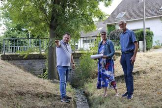 Freie Wähler Ratsmitglieder Alexander Albrecht, Melanie Hürlimann und Reiner Friedsam (v.li) machten sich ein Bild über die geplante Vergrößerung des Abflussquerschnitts für den Mühlengraben in Bad Bodendorf.