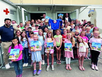 Buchübergabe in der St. Martin Grundschule in Dernau: Alle Schulkinder begrüßen das Alpaka Indigo und freuen sich riesig über sein Geschenk, das Kinderbuch „INDIGO ICH SCHAFFE DAS!“. (Foto: Jeannette Zimmermann / DRK-Kreisverband Ahrweiler e.V.)
