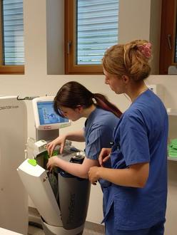 Leben rettende Hightech hautnah: Florentine Hahlbrock, stellvertretende leitende MTR der Radiologie Remagen, erklärt einer Praktikantin den Aufbau eines Kontrastmittelinjektors direkt am Gerät – ein eindrucksvoller Einblick in die moderne Diagnostik.