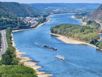 Durch den fallenden Rheinpegel wird die Fahrrinne für die Schifffahrt enger. Teilweise weichen sich die schwach beladenen Schiffe aus, wie am Kohlefrachter zu erkennen ist. Nur von oben ist die Ladung zu sehen. Das Bild entstand auf dem Krahnenberg bei Andernach und zeigt den Rheinabschnitt zwischen Namedy und Remagen. Ganz links am Bildrand ist die vierspurige B9 und rechts neben dem Hammersteiner Werth mitsamt der großen Kiesbank die B42 vor der Rheinbrohler Ley zu sehen. Die Kiesbänke auf beiden Uferseiten werden täglich größer und Vater Rhein wird immer weniger. — Foto: Rolf Niemeyer