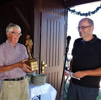 Ein weiteres Dankeschön ging an Sandra Schilling mit Helferteam, die durch ihren Einsatz dieses Sommerfest erst möglich gemacht haben. Im Laufe eines so langen Vereinslebens ereignen sich natürlich immer viele nette Geschichtchen, von denen eine besondere Erwähnung fand: Anlässlich des 75-jährigen Jubiläum hatte die Stadt Sinzig dem Verein einen geschnitzten Wandersmann überreicht, der viele Jahre lang bei den Mitgliederversammlungen an denjenigen mit den meisten Wanderkilometern übergeben wurde. Nach 2001 wurde die Figur durch einen Wanderpokal ersetzt und geriet in Vergessenheit. Im letzten Jahr hatte ein aufmerksamer Mitbürger eben diesen Wandersmann bei eBay ersteigert, erkannte, dass er wohl zum Sinziger Eifelverein gehört und wandte sich an Guido Reckhaus. Die Auslagen wurden selbstverständlich erstattet, und so kam der treue Wandergeselle wieder zurück an alte Wirkungsstätte. Jetzt hat er seinen endgültigen Platz gefunden: Als dem mit fast 90 Jahren ältesten aktiven Mitwanderer überreicht ihn Guido Reckhaus an Alfons Friedsam, der viele Jahre auch als Wanderführer aktiv war. Selbstverständlich wurde eine Namensplakette mit der diesjährigen Jahreszahl angebracht. Eine nette kleine Geschichte, die das Leben schreibt.