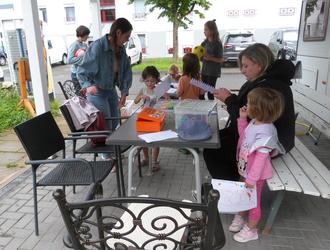 Auch Anfang August wurde trotz des schlechten Wetters wieder ein Treffen vor Ort organisiert, das wegen des Regens in den Carport eines Anwohners verlegt wurde. Die Kinder und auch einige Elternteile bastelten Armbänder, malten Bilder und spielten zusammen.