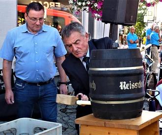 Nun wurde den beiden Fässchen zu Leibe gerückt. Schützenkönig Ingo Schein entlockte mit gezielten Schlägen die ersten kühlen Tropfen. Ein kleines Missgeschick bei Gunter Windheuser: Der Holzhammer brach ab und der Zapfhahn war etwas lädiert. Doch auch dieses Fass musste letztlich seinen Widerstand aufgeben, und so floss reichlich Freibier. Die Kirmes war nun auch offiziell eröffnet. Buntes Treiben am Abend und am ganzen Sonntag bei weiter viel Sonnenschein brachten einen gelungenen Start.