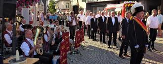 Gegen 18 Uhr wurde es am Rande des Kirchplatzes unruhig: Gruppen formierten sich zum Festzug durch die Barbarossastadt: Vorneweg Freiweg, die mit klingendem Spiel die folgenden Formationen durch die Stadt führten. An der Spitze die „Jusseps Junge“ mit Hauptmann Hans-Peter Knops, dazwischen noch Bürgermeister Andreas Geron, Ortsvorsteher Gunter Windheuser und Pastor Frank Werner. Mit dabei waren Schützen, der Turnverein, Bürgerforum, Möhne und als Abordnung von der Höhe der JGV Koisdorf.