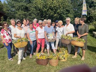 Auch in diesem Jahr traf sich wieder eine Gruppe von Frauen auf dem Katharinenhof bei Hilde Kurp, um diese jahrzehntelange Tradition zu pflegen. Die vorher gesammelten Wildkräuter und Blumen wurden in geselliger Runde zu bunten Sträußen gebunden und schnell füllten sich die Körbe für die Kräuterweihe am Sonntag. Nach getaner Arbeit ließen die Damen den Nachmittag bei Kaffee und Kuchen im Garten gemütlich ausklingen. Diesmal war es das letzte Mal bei Hilde auf dem Hof. Als Dankeschön dafür, dass sich die Frauengemeinschaft 25 Jahre bei ihr zum Sträuße binden treffen durfte, bekam sie einen Präsentkorb überreicht.