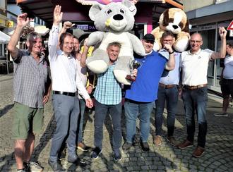 SINZIG. DG. Inzwischen schon Tradition geworden ist der von Bürgermeister Andreas Geron ins Leben gerufene „Wettkampf“ der Sinziger Ortsvorsteher am Kirmesmontag. In fünf unterschiedlichen Disziplinen ging es um Treffsicherheit, Geschicklichkeit und Schätzvermögen, ein wenig Fortuna war natürlich auch mit dabei. Alexander Albrecht (Bad Bodendorf), Karl-Heinz Arzdorf (Koisdorf), Volker Holy (Löhndorf), Hans-Jürgen Koffer (Franken), Mario Wettlaufer (Westum) und Gunter Windheuser für die Kernstadt begaben sich zunächst zum Schießstand. Nicht alle erwiesen sich hier als besonders treffsicher. Die fehlenden Punkte konnten nun bei Enten schätzen gesammelt werden. Es ging diesmal also nicht um das insbesondere bei Kindern beliebte Angeln, es musste vielmehr geschätzt werden, wie viele Enten insgesamt in Umlauf sind, es waren 330. Beim Luftballon treffen war wieder Zielgenauigkeit gefragt. Am Süßwarenstand galt es, möglichst genau 75 Gramm gebrannte Mandeln in eine Tüte zu packen. In Erwartung dessen, dass die Tüte sicher zum eigenen Verzehr mitgenommen werden durfte, packten einige vorsorglich etwas mehr hinein. Das gab dann zwar keine Punkte, aber dafür viele süße Mandeln. Vor dem letzten Wettbewerb lagen Bad Bodendorf, Franken und Koisdorf mit 15 Punkten gleichauf, gefolgt von Sinzig (12) und Löhndorf (10). Nun galt es, zum richtigen Zeitpunkt eine automatische Schere anzusetzen -und wem dies gelang, der konnte eine riesige Plüschfigur mitnehmen. Jeder hatte reihum mehrere Versuche, das geschickteste Händchen, sicher gepaart mit einer Portion Glück, hatten hierbei Volker Holy und Gunter Windheuser, die damit ihr Punktekonto auf 16 bzw. 18 Zähler hochschrauben konnten. Somit ging der Wanderpokal in diesem Jahr nach Sinzig. Westum war hierbei recht deutlich abgeschlagen, was Mario Wettlaufer süffisant und mit einem Schuss Galgenhumor kommentierte: „Wir haben damit den letzten Platz erfolgreich verteidigt.“ Zum gemütlichen Umtrunk ging es anschließend an die Getränkestände.